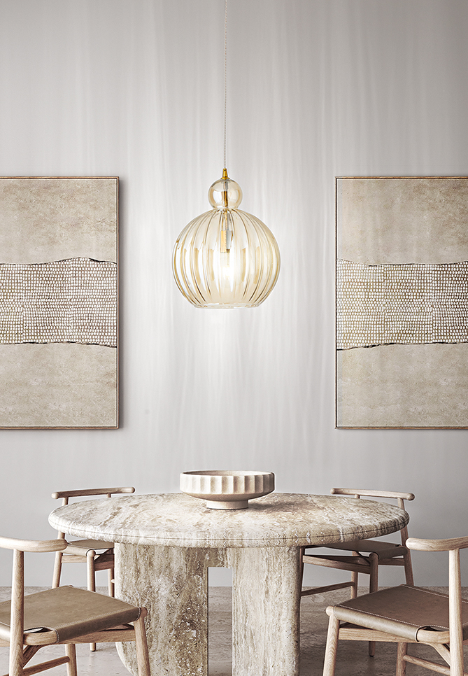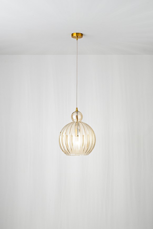 Collezione con struttura in metallo e alluminio verniciato a polvere. Diffusore in vetro plissettato a scelta nei vari colori e diametri. Cavo supporto/alimentazione treccia teflonato trasparente. Colore: cognac specchiato + ottone brunito D.32 x H.191 cm 1 x E27 MAX 40W 220-240V 50/60Hz IP20 - Classe I H. regolabile