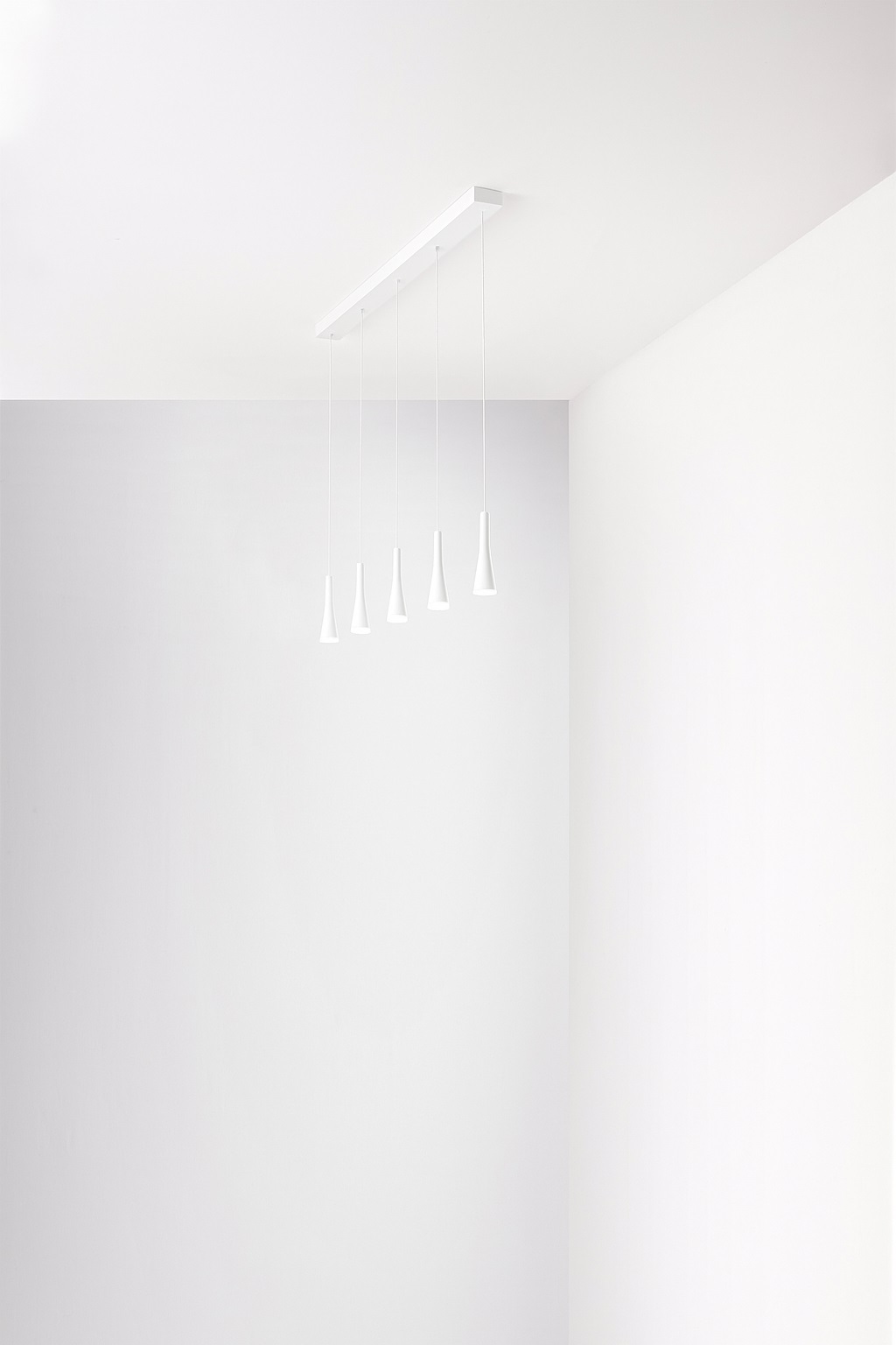 Sospesnione con struttura in metallo e alluminio verniciato a polvere. Diffusori in acrilico removibile e intercambiabile con un anello di chiusura in metallo con schermo in acrilico (incluso).