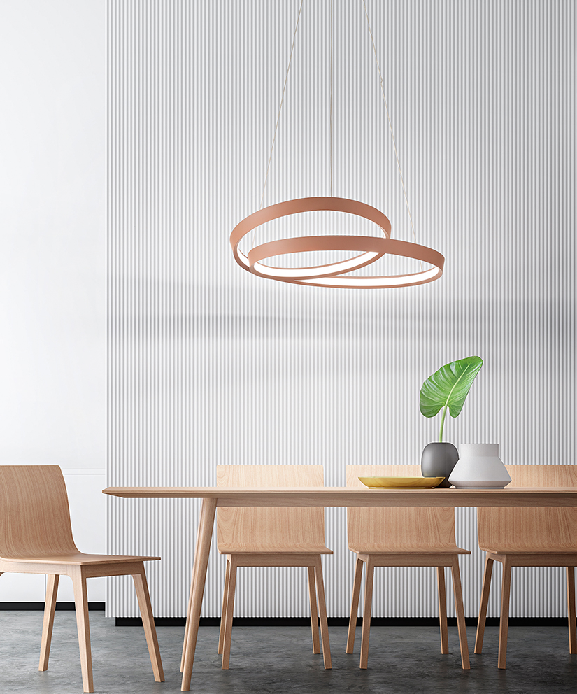 Collezione con struttura in metallo e alluminio verniciato a polvere nelle varie finiture. Diffusore in silicone. Nelle sospensioni cavi supporto/alimentazione in acciaio rivestito in PVC.