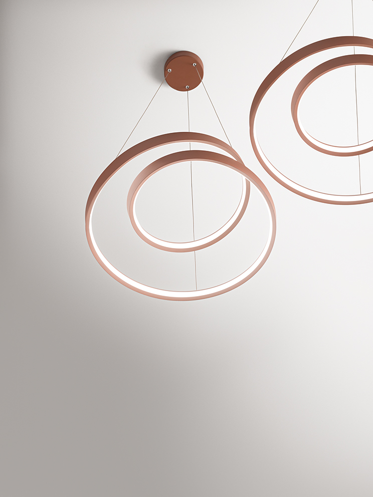 Collezione con struttura in metallo e alluminio verniciato a polvere nelle varie finiture. Diffusore in silicone. Nelle sospensioni cavi supporto/alimentazione in acciaio rivestito in PVC.