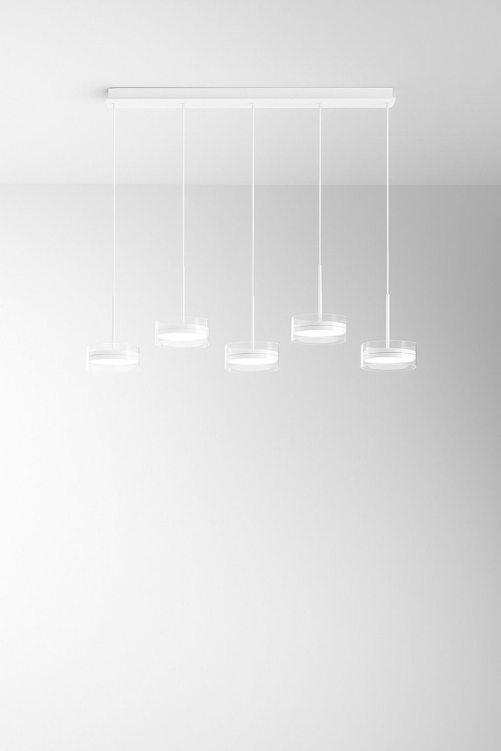 Sospesnione con struttura in metallo e alluminio verniciato a polvere. Diffusori in vetro trasparente (borosilicato). Prodotto biemissione.